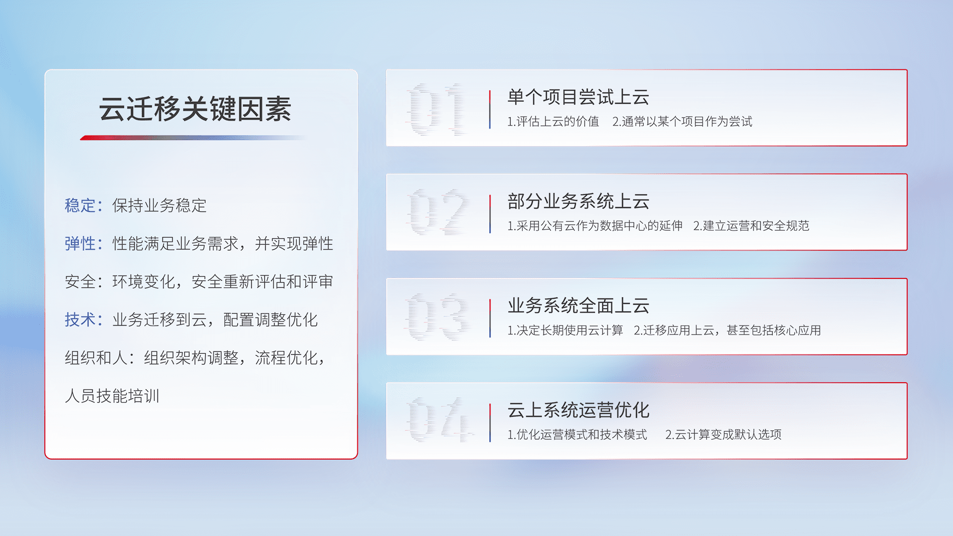 结合实际业务,,,从规划设计、、、云平台选型、、云原生改造、、数据迁移、、集成交付,,,迁移全过程为客户识别最佳上云路径,,做好风险识别管理,,,,设计网络架构、、身份权限、、、安全审计合规、、操作审计、、、日志审计、、、、监控告警策略、、、多站点容灾设计等,,,,对云上基础设施进行整体规划,,,,提升IT治理水平,,以满足弹性、、高可用、、高性能的需求。。。。