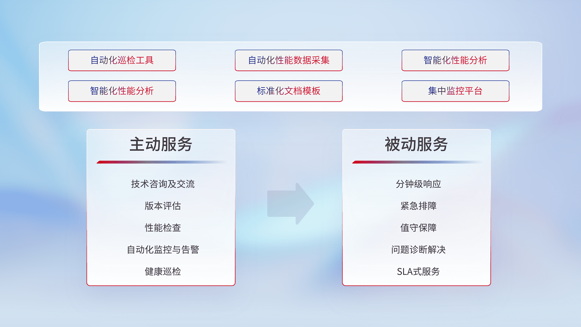 智能化工具和标准化文档,,,,保障服务质量,,提供主动服务(包含技术咨询、、版本评估、、、、性能检查、、、、自动化监控与告警、、、、健康巡检)和被动服务包含(分钟级响应、、、紧急排障、、、值守保障、、问题诊断解决、、SLA服务)。。